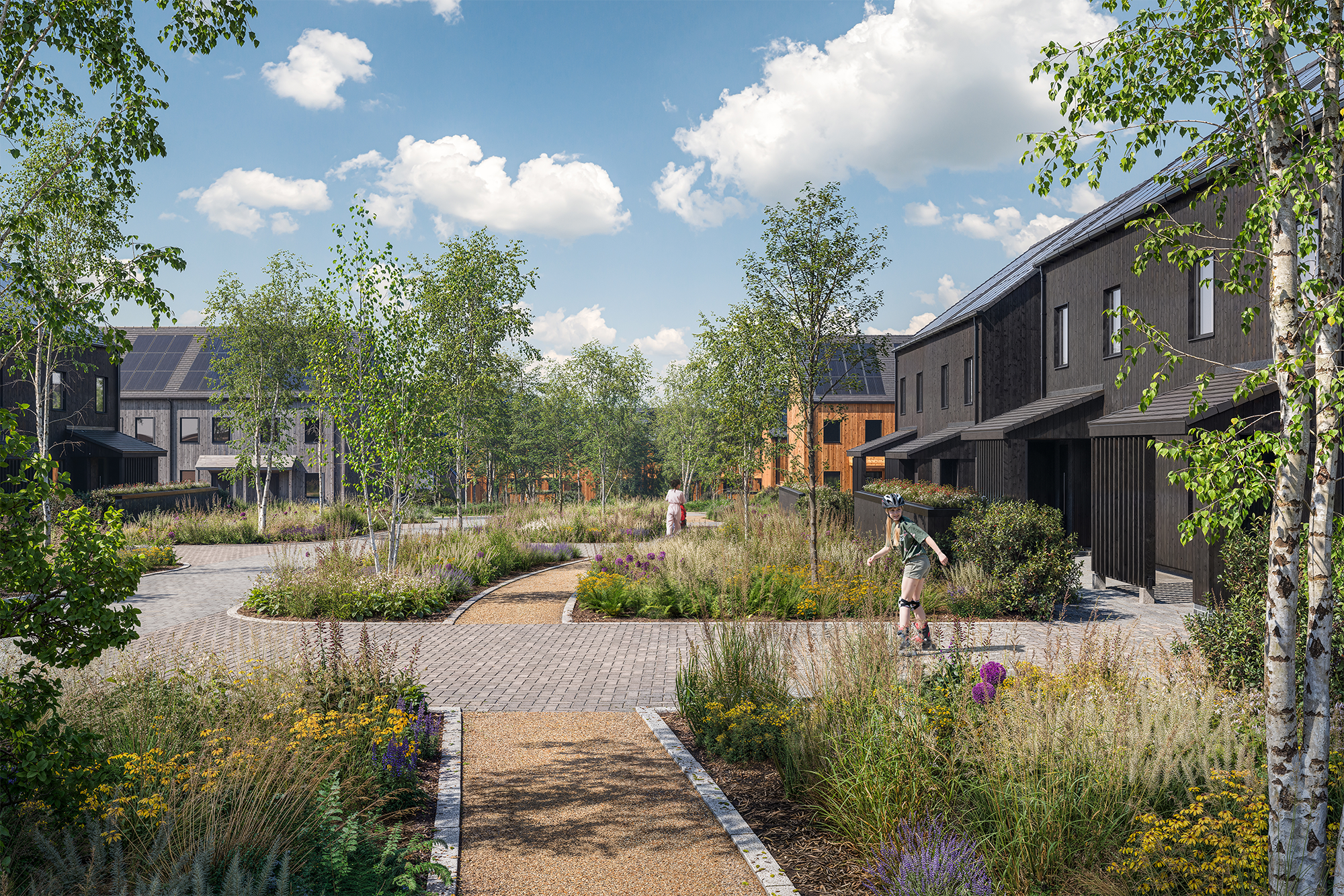 As masterplanner and lead consultant, Mikhail Riches have been working together with gs8 and Boehm Lynas to developed a landscape-led scheme, on grey-belt land, for 232 new low carbon, zero-bills homes located within a 15-minute walk of Chigwell underground station. The scheme includes a new GP surgery, shared community growing spaces, a village green and a linear park that have been closely developed with the local community to target a 24% uplift in biodiversity. The zero-bills scheme provided by Octopus Energy means that residents will pay zero energy bills for the home for a minimum of 5 years in partnership with Octopus Energy – ensuring that residents have healthy homes and are protected from fuel poverty.