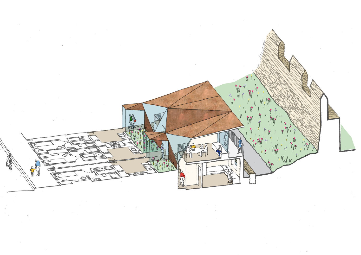 With the college, we co-created a new solution using half levels, where we proposed to dig down and reveal the top of the second city wall; the rampart would be reinstated as a sloped wildflower garden, providing the new pedestrian route back to the New College, & with a new structure along the city wall giving the much needed new 35 ensuite bedrooms and teaching rooms alongside 37 refurbished student rooms in the reconfigured terrace.