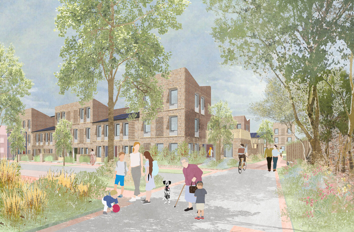 The new neighbourhood at Ordnance Lane knits together a previously disjointed part of the urban fabric to the south of York’s City Centre. The ‘New Ordnance Lane’, car free route connects the existing amenities of Fulford Road (to the east) with the nurseries, gyms, retail and office uses of the Hospital Roads trading estate (to the west). This east-west axis reinstates the original front of the retained building on site, a former military ‘Married Quarters’ and provides new homes, landscapes, community spaces and commercial spaces off this central street. A green link, cycle and pedestrian route running along the east boundary, connects residential areas to the north and south of the site, and provides access to the city’s cycle highway which connects to the tow path of the River Ouze and leads to the city centre. To the east of the site there are 5 rows of new terrace housing, bookended with 3-storey flats, each with their own front door.