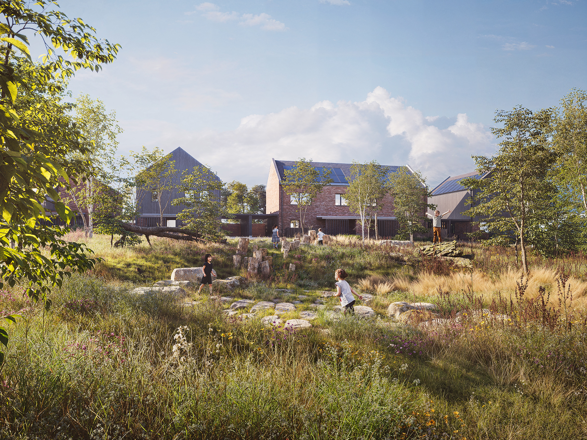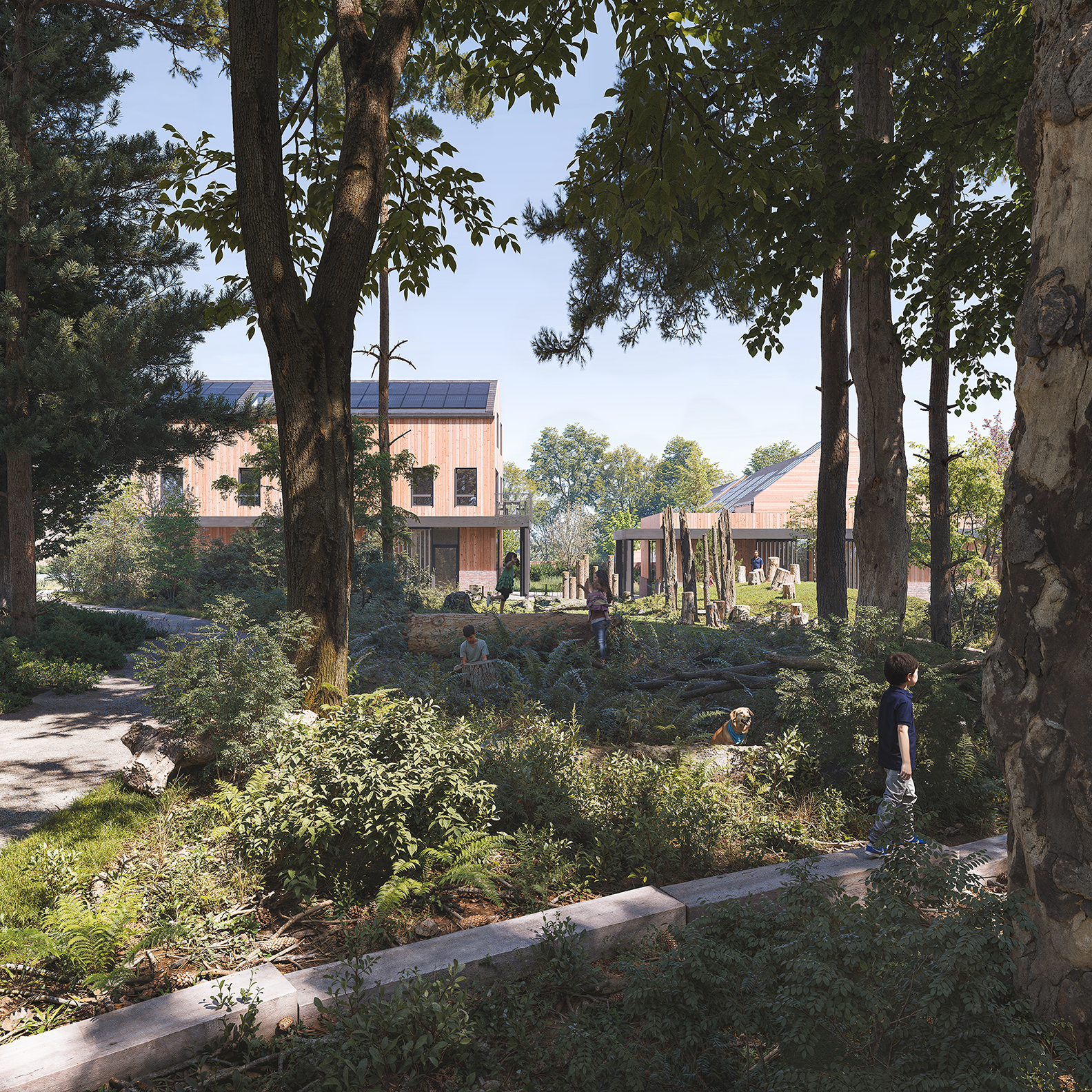 As masterplanner and lead consultant, Mikhail Riches have worked closely with gs8 and Boehm Lynas to develop a new sustainable community on grey-belt land in Watford. A 12-minute walk from Carpenders Park Train Station, this new development of 96 planet positive homes will restore a native woodland forest with play spaces, a wildlife pond and Sentinel Oak trees. Promoting active travel and community, the development will feature a DIY centre, bicycle club, fitness facilities and a car club that can benefit new residents and the existing neighbourhood. Careful orientation of homes and solar panels alongside air source heat pumps and battery storage mean that these homes will benefit from zero energy bills in partnership Octopus Energy for a minimum of 5 years – ensuring that residents have healthy homes to live in and are protected from fuel poverty.