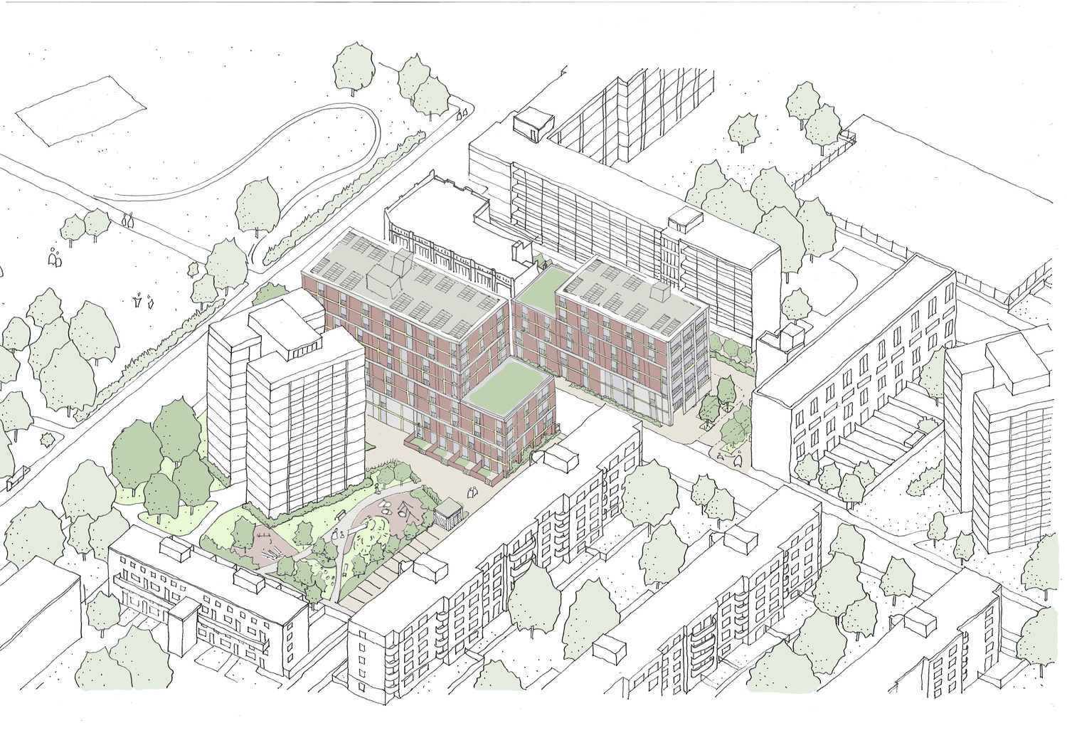 We won 2 design competitions to deliver housing on 3 sites as part of Hackney Council’s Housing Supply Programme. At Wimbourne Street we have provided 59 homes and 1 commercial unit on 2 separate sites across the street – 62% of which are affordable. The site is next to the popular and memorable Wimbourne House, a 19th century warehouse left stranded by bombing during World War II. We proposed stepping the building line back from the edge of pavement, allowing us to maintain the view of Wimbourne House when looking south along New North Road. This move also allows us to retain the excellent large specimen trees, which serve as a buffer between the accommodation and the relatively noisy traffic. This is an important corner; enhanced and emphasised with a landscaped entrance courtyard, serving as a prelude to the double-height main entrance.