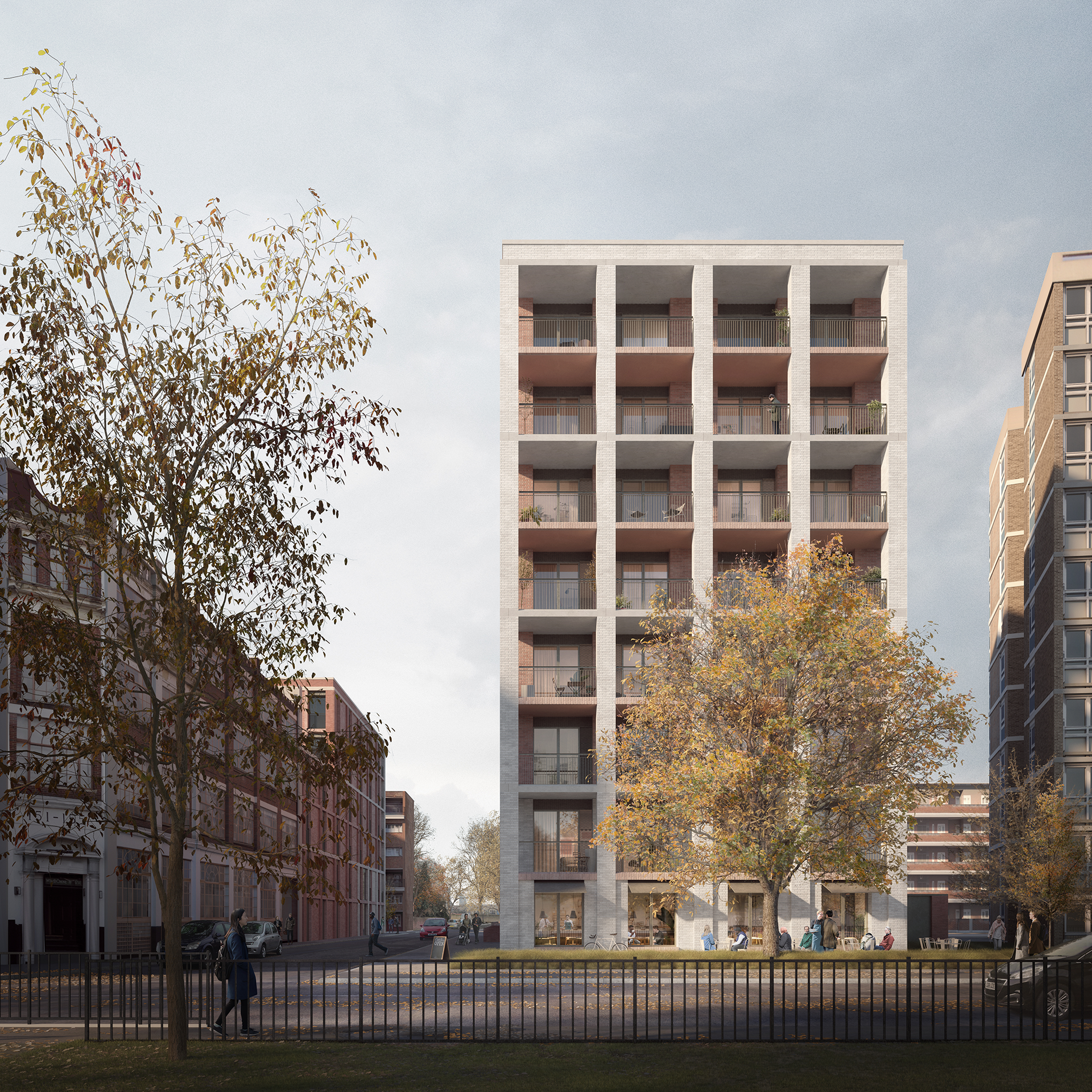 We were inspired by Wimbourne House; its large glazed openings and brick pilasters, its cornicing every two storeys, how the façade onto the park is made special with a white render finish, and how the ground and first floors are painted white to form a ‘base’. All of these themes are seen in our scheme, with the 2 storey base and façade onto the park given a grander treatment, using a palette of white brick and precast concrete. Every second floor has a linear ‘string course’, emulating the two storey pilasters of Wimbourne House. Secondary to this, there is a language of anodised aluminium frames, panels of brickwork or glass, as well as finer substructure for the balconies. The majority of flats enjoy 6 metre wide kitchen/living rooms, with many having 6 metre wide terraces.